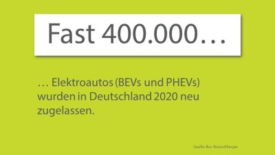 Fast 400.000 Elektroautos wurden im vergangenen Jahr in Deutschland neu zugelassen. 2019 lag dieser Wert noch bei 112.000.